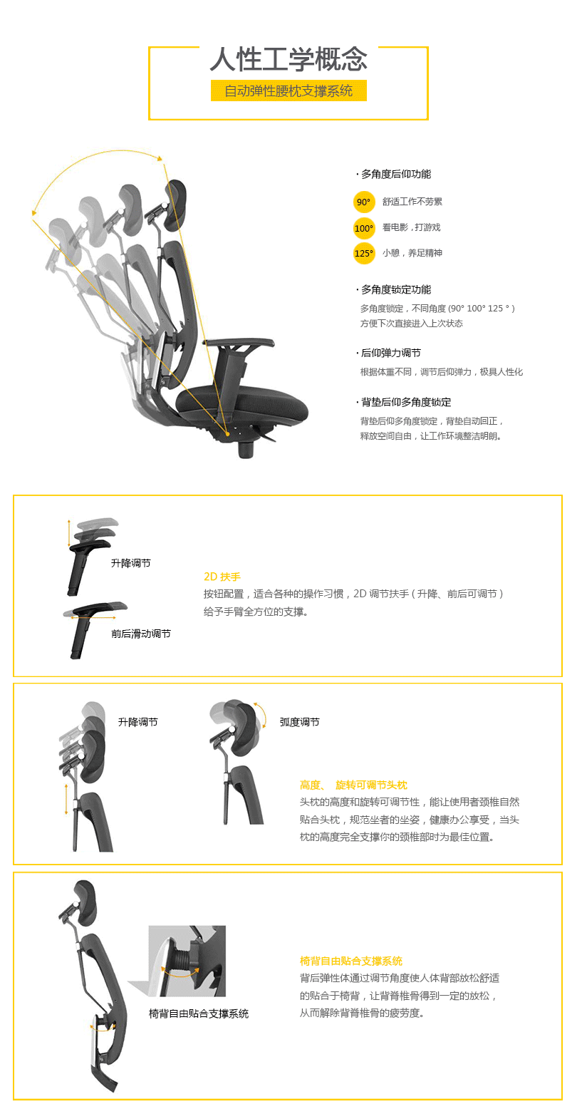 CG-E1053的优美设计有利于持久的舒适和美感。工学椅的结构和功能利用同步倾仰底盘控制功能锁定,滑座和高度调节。高度和角度均可调的扶手和头枕都包含在这张特有的工学椅里。