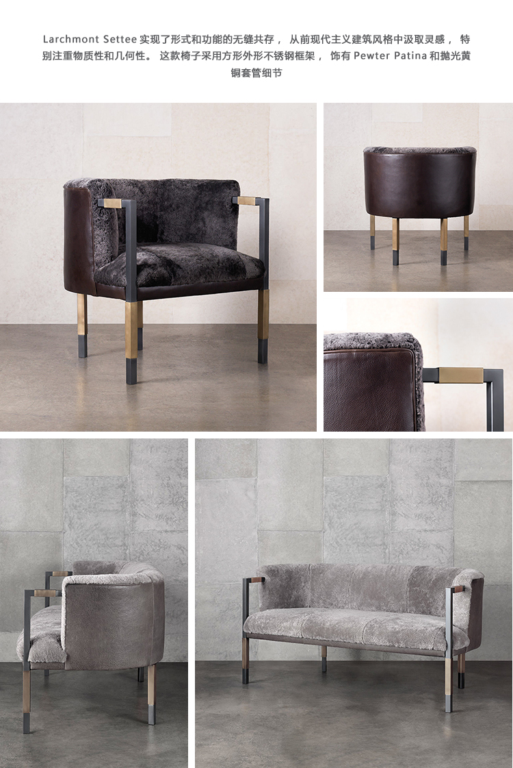 Larchmont Settee实现了形式和功能的无缝共存,从前现代主义建筑风格中汲取灵感,特别注重物质性和几何性。 这款双人长靠椅采用方形外形不锈钢框架,饰有Pewter Patina,和抛光黄铜套管细节。