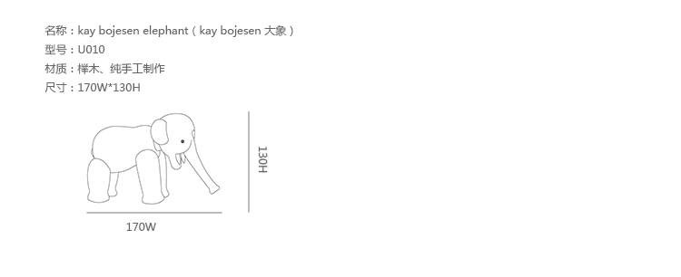Kay Bojesen Elephant(Kay Bojesen 大象)设计于1953年,出自丹麦设计大师 Kay Bojesen 的设计作品,精致的木制动物系列,是 Kay Bojesen 为人熟知的珍藏作品系列,采用不同的橡木、枫木、柚木等原木素材,保留木材的独特纹理,刻画出各种不同让人莞尔一笑的动物姿态,跳脱生活中的烦琐与紧张,简单的玩偶,轻松的神情,带您回归孩时的天真与简单快乐。精致而限量珍藏的作品系列,适合您作为桌面摆设,或是作为送礼小物,分享您生活中的快乐写意。